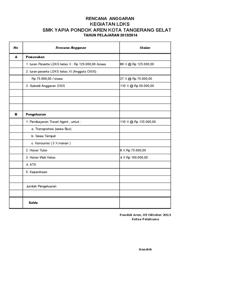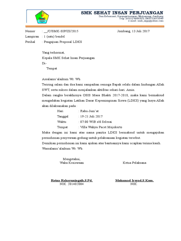Atas partisipasinya kami ucapkan terima kasih. Proposal kegiatan osis smk al hikmah 2 sirampog ldks ( latihan dasar kepemimpinan siswa) i. Diterbitkan minggu, juni 18, 2017. Demekian proposal kegiatan latihan dasar kepemimpinan siswa (ldks) ini dibuat dengan harapan mendapatkan partisipasi yang besar dari berbagai pihak, demi terwujudnya acara tersebut. Maka dengan ini kami atas nama panitia ldks bermaksud untuk mengajukan permohonan bantuan dana sebesar rp 673.000,00 (enam ratus tujuh puluh tiga ribu ribu rupiah) yang akan digunakan untuk pelaksanaan kegiatan tersebut, adapun rencana kegiatan dan anggaran dana terlampir pada proposal.